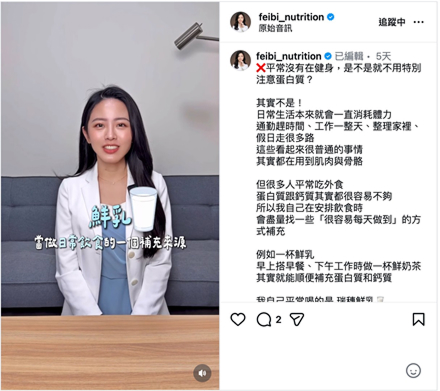營養師 Feibi強調,在眾多補給選擇中,鮮乳是極佳的天然來源,能同時提供蛋白質與鈣質「關鍵雙營養」。相較於豆漿提供的植物性蛋白,鮮乳的動物性蛋白吸收率更佳,對於組織修復能提供更到位的支援。